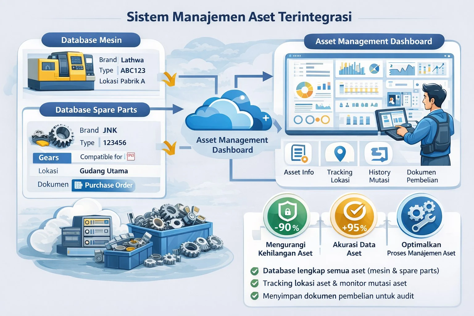 Database spare parts mencakup informasi lengkap seperti brand, part number, nama part, kompatibilitas dengan mesin tertentu, lokasi penyimpanan, stok tersedia, dan dokumen pembelian. Dengan sistem ini, perusahaan dapat memiliki database lengkap semua aset termasuk mesin dan spare parts dengan informasi yang akurat dan terupdate, memudahkan tracking lokasi aset, memantau perpindahan/mutasi aset, dan menyimpan dokumen pembelian untuk keperluan audit dan compliance. Sistem ini mengurangi kehilangan aset hingga 90%, meningkatkan akurasi data aset hingga 95%, dan mengoptimalkan proses manajemen aset melalui digitalisasi yang efektif.